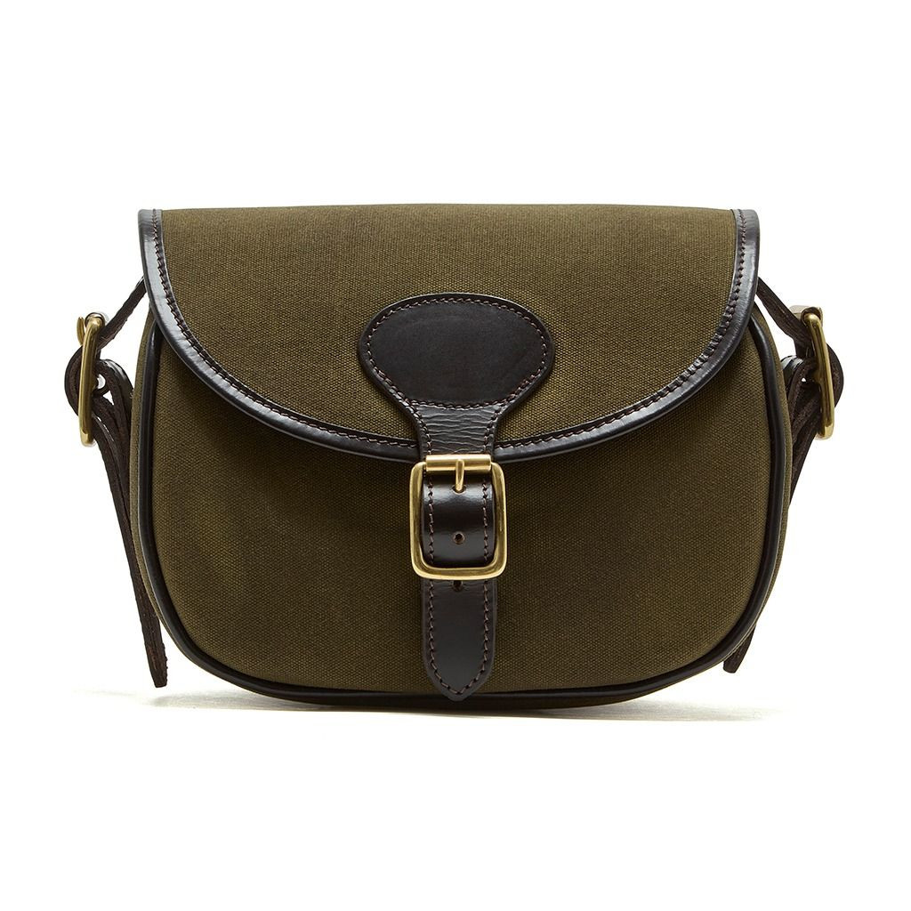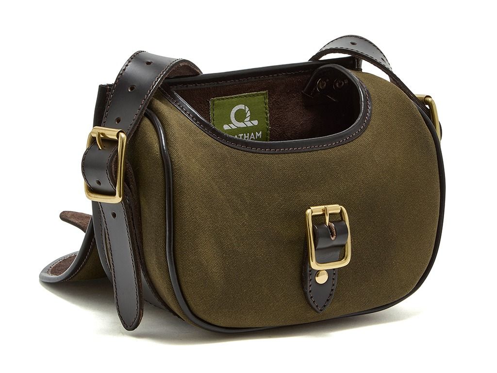 Expertly crafted from durable 12oz antique waxed canvas combined with rugged oiled leather, it is an oval-shaped, satchel-style bag with a 100 cartridge capacity. It features an adjustable-length shoulder strap ensuring the perfect fit, and is finished with stylish brass buckle and hardware detail.